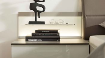 Die Kombination aus kieselgrauen und weißen Kunststoffoberflächen mit weißen Glasauflagen harmoniert perfekt mit der integrierten LED-Beleuchtung. Die fest verbauten LED-Leuchtmittel mit der Energieeffizienzklasse F (Spektrum A bis G) sorgen für ein dezentes, warmes Licht direkt am Bett. Über den praktischen Kippschalter steuerst du die Beleuchtung ganz bequem.
