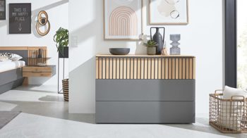 Die Schubladenkommode 528091 aus der Interliving Schlafzimmer Serie 1029 kombiniert graphitfarbenen Lack mit Wildeiche-Massivholz.
