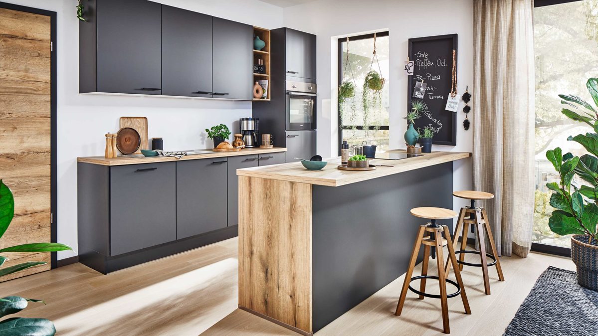 supermattes Grafit und Evoke Eiche-Nachbildung, kombiniert mit schwarzen Bügelgriffen und Arbeitsplatten in Evoke Eiche-Nachbildung