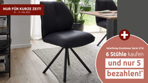 Die Interliving Esszimmer Serie 5116 lässt dir alle Freiheiten bei der Gestaltung: Kombiniere vier Tischplattenfarben, zehn Tischgestelle in zwei Farben und sechs Größen zu deinem persönlichen Lieblingsstück. Bei den Stühlen hast du die Wahl zwischen Stoff und Leder, mit oder ohne Drehfunktion, und findest garantiert das passende Modell – ob als Esszimmerstuhl, Funktionsstuhl oder Dreh-Speisezimmerstuhl.