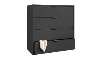 Mit ihren anthrazitfarbenen Mattlackoberflächen verkörpert die Schubladenkommode Bonnie moderne Eleganz. Schwarze Metallgriffe und praktisch höhenverstellbare Möbelgleiter runden das stilvolle Design harmonisch ab. Zu den qualitativen Höhepunkten gehören überdies die widerstandsfähigen abgerundeten Dickkanten.