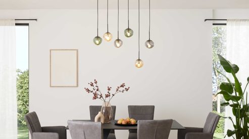 Mit der Hängelampe aus der Interliving Leuchten Serie 9350 bringst du ein echtes Design-Statement in deinen Wohnraum. Sechs organisch geformte, matte Glas-Lampenschirme in den Farbtönen Amber, Grün und Rauch sorgen für ein lebendiges Lichtspiel, während der mattschwarze Metallsockel und die schwarzen Textilkabel der Pendelleuchte einen modernen Look verleihen.